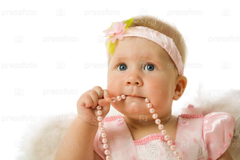 Очаровательная девочка с бусами на белом фоне
