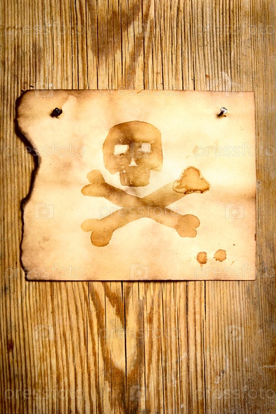 Фон из пожелтевшей бумаги с рисунком черепа и костей на деревянной стене