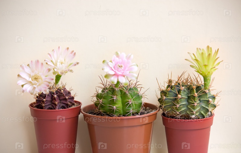Три кактуса с цветами на светлом фоне