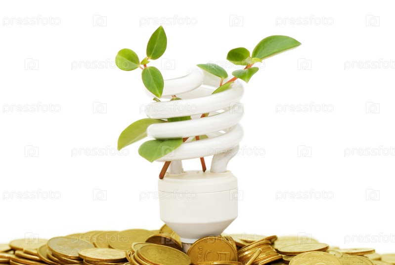 Энергосберегающая лампа с зеленым растением и монетами на белом фоне