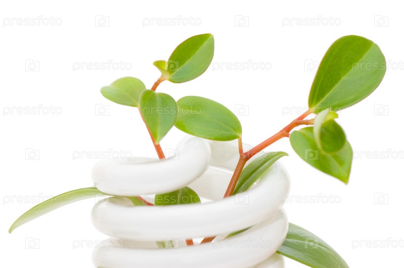 Энергосберегающая лампа с зеленым растением на белом фоне