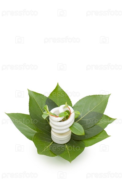 Энергосберегающая лампа с зеленым растением на белом фоне