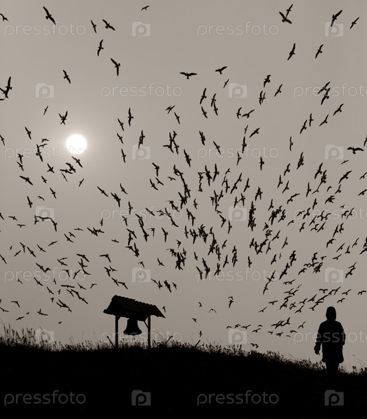 Стая птиц и человек возле колокола