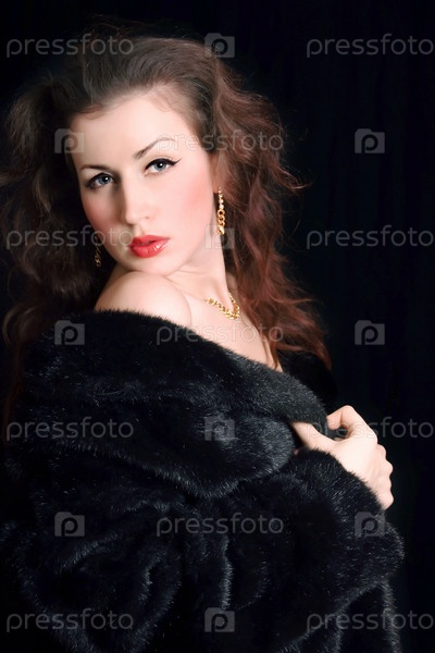 Молодая женщина в черной шубе и ювелирных украшениях