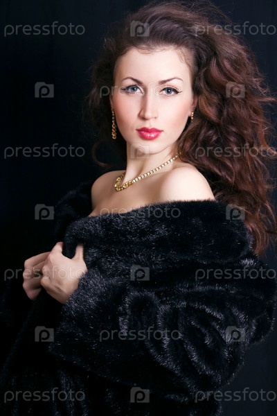 Молодая женщина в черной шубе и ювелирных украшениях
