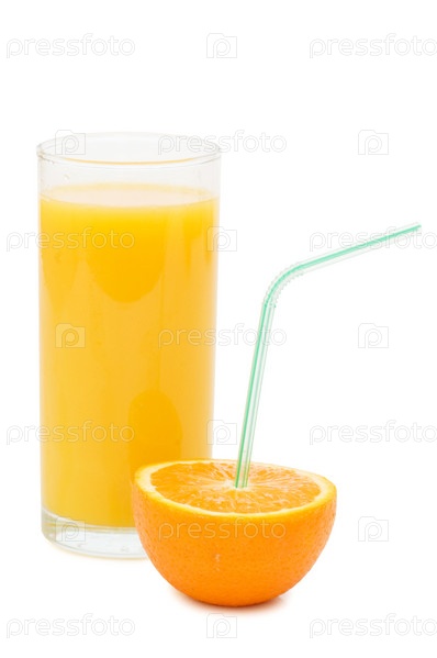 Апельсиновый сок в стакане и апельсин с трубочкой