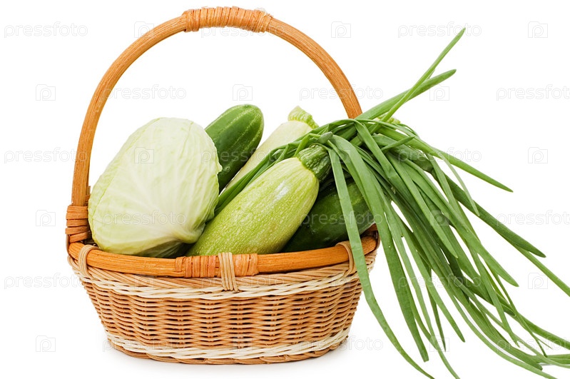 Плетеная корзинка с овощами на белом фоне