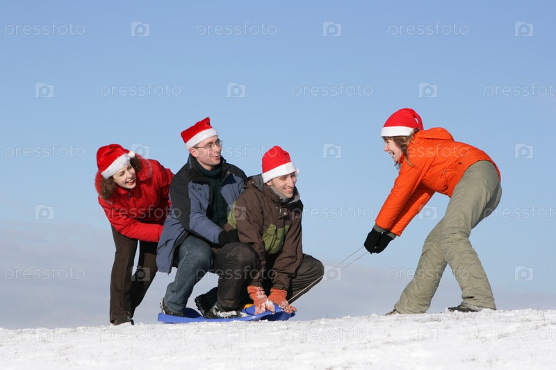 Друзья катаются на санях зимой
