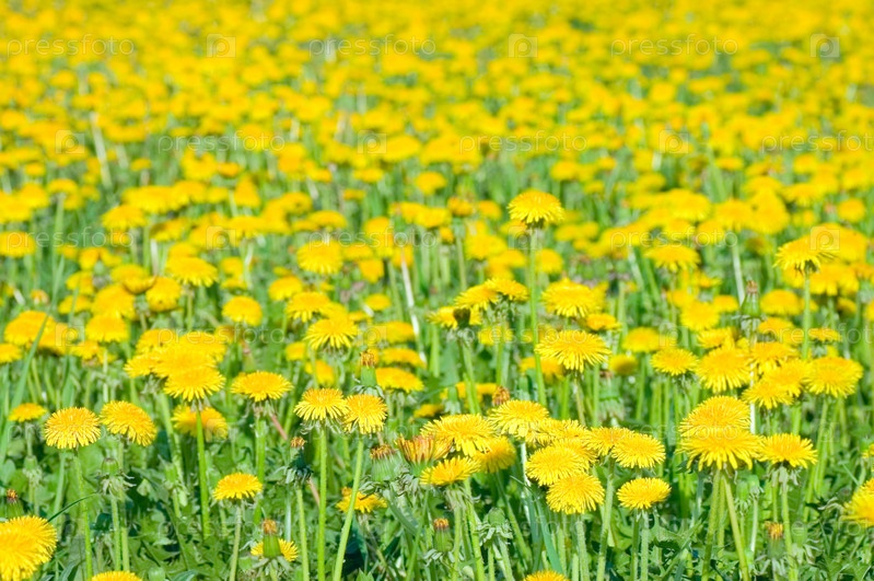 Желтые одуванчики на зеленом лугу