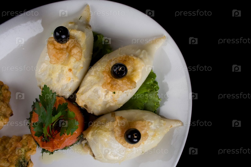 Фаршированные кальмары на белой тарелке