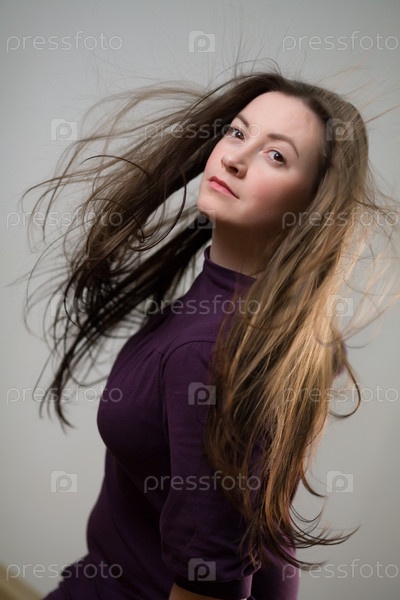 Девушка с развевающимися волосами на сером фоне
