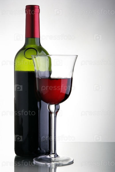 Бокал и бутылка красного вина на сером фоне