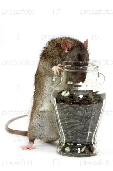 Большая серая крыса на белом фоне с семечками подсолнечника