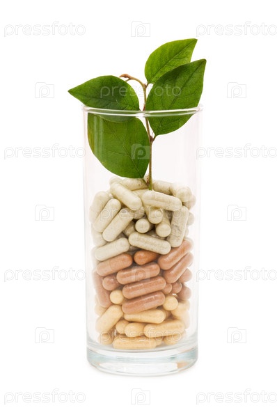 Таблетки и зеленый росток в стеклянном бокале на белом фоне