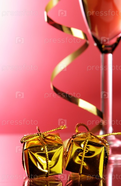 Два бокала шампанского и новогодние украшения на розовом фоне