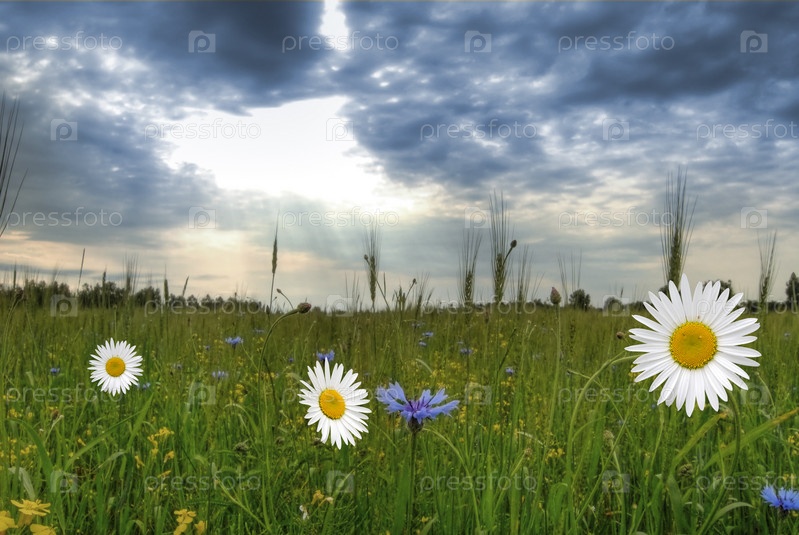 Белые ромашки на зеленом лугу