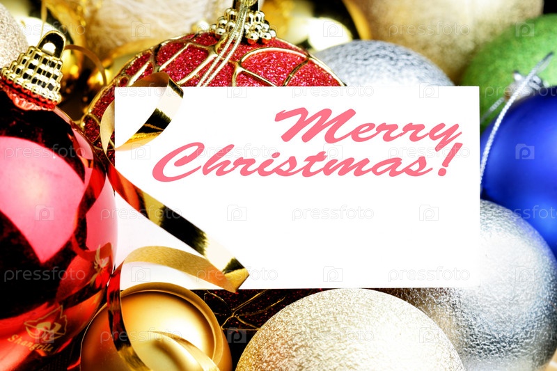 Красочные рождественские шары и карточка с текстом "Счастливого рождества"