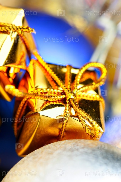 Золотая коробочка и рождественские шары в качестве фона