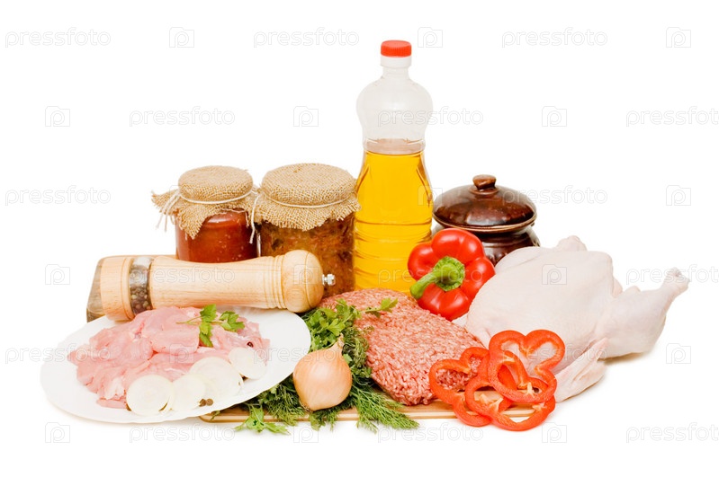 Свежее мясо, масло, овощи и специи на белом фоне