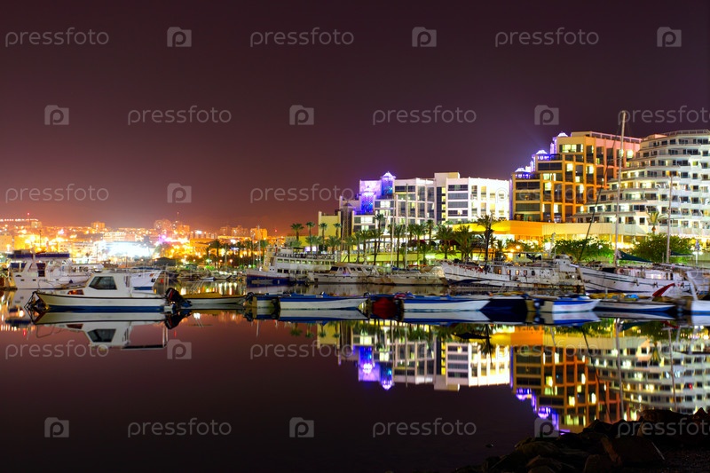 Отели и яхты в ночном Эйлате, Израиль