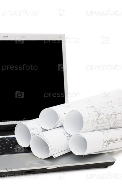 Чертежи и ноутбук на белом фоне