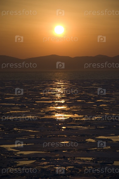 Закат над горами и морем, покрытым льдом