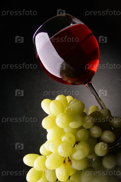 Бокал красного вина и зеленый виноград на сером фоне
