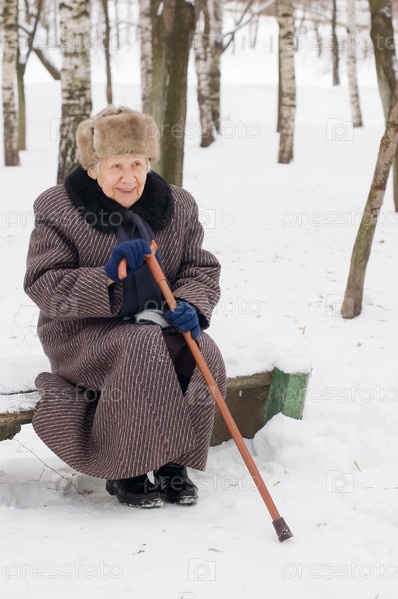 Портрет пожилой женщины, сидящей на лавочке в парке
