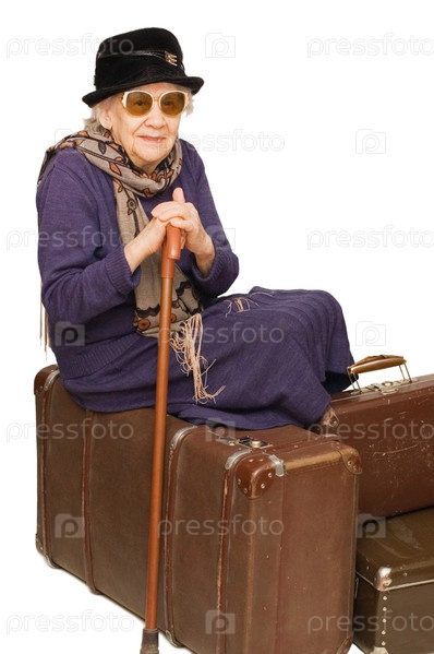 Портрет пожилой женщины, сидящей на старых чемоданах