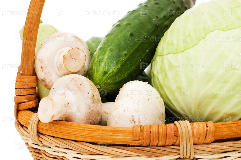 Плетеная корзина с овощами на белом фоне
