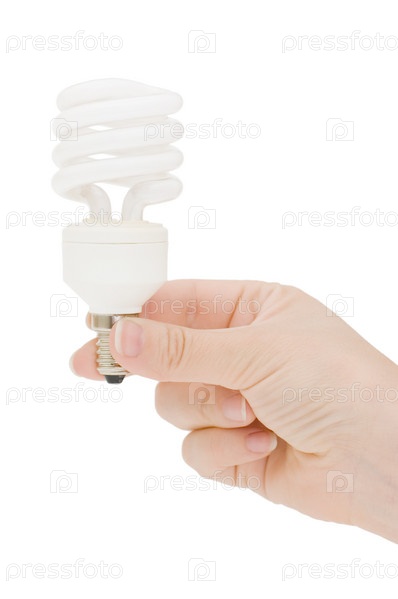 Спиральная люминесцентная лампа в руке на белом фоне