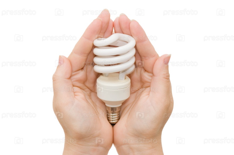 Спиральная люминесцентная лампа в ладонях на белом фоне