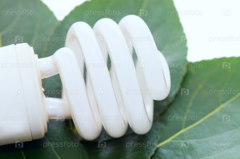 Спиральная люминесцентная энергосберегающая лампа на зеленых листьях