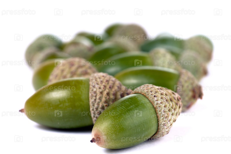Горсть зеленых желудей на белом фоне