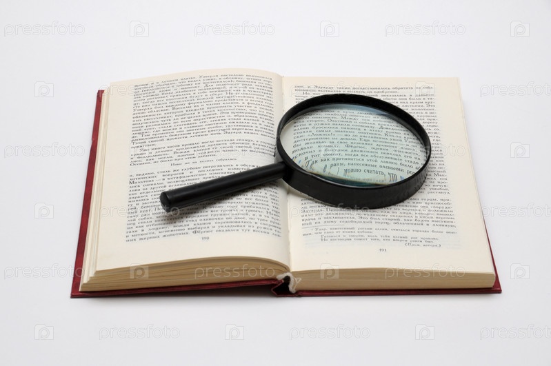 Лупа на открытой книге, на белом фоне