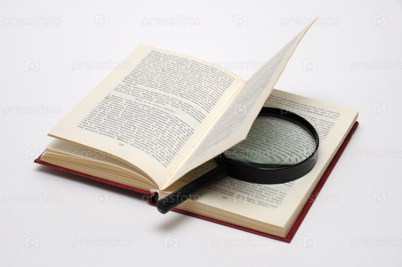 Лупа на открытой книге, на белом фоне