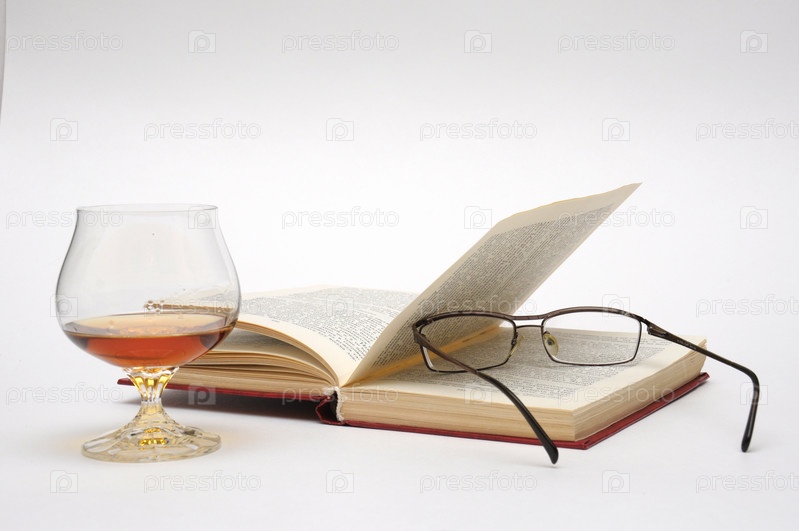 Очки на открытой книге и бокал коньяка. На белом фоне