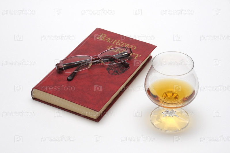 Очки на книге Вальтера Скотта и бокал коньяка. На белом фоне