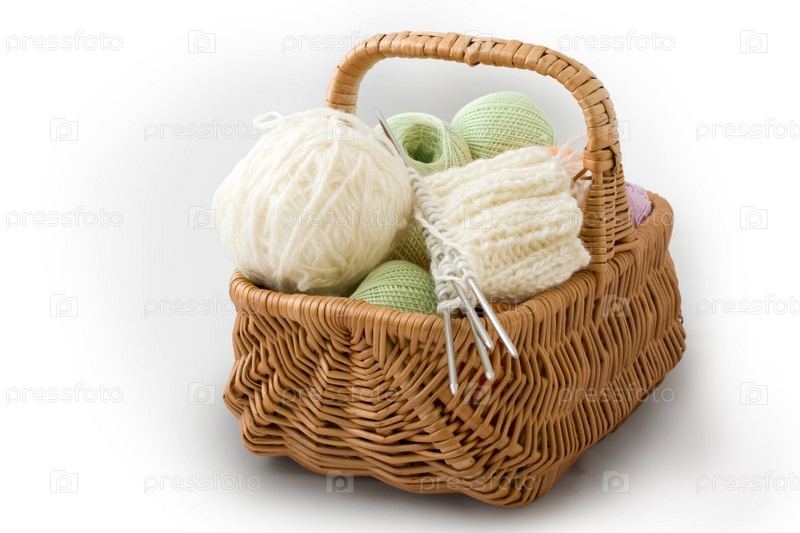 Мотки пряжи и вязание в корзинке