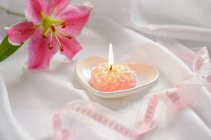 Розовый цветок, лента и свеча на белом шелке