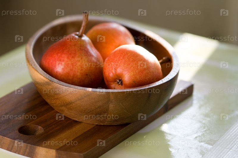 Красные груши в деревянной миске