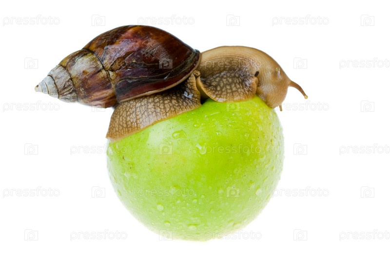 Улитка сидит на зеленом яблоке, изолированном на белом