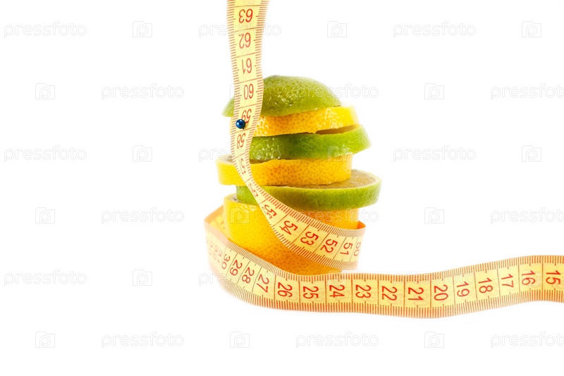 Нарезанные лимон и лайм и измерительная лента на белом фоне