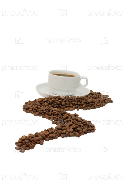 Чашка кофе с кофейными зернами на белом фоне