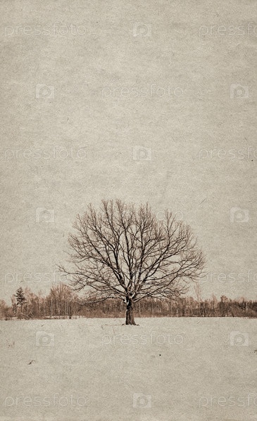 Зимний пейзаж с деревом, состаренное фото, сепия