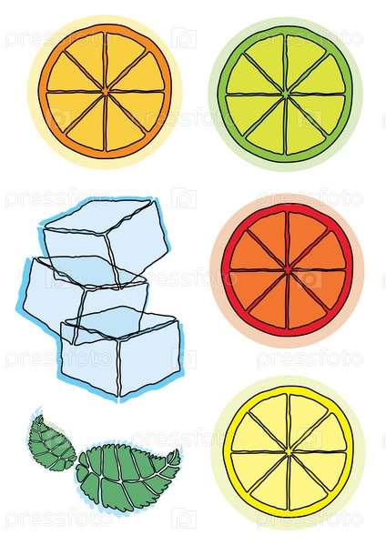 Изображение цитрусовых, кубиков льда и листов мяты на белом фоне