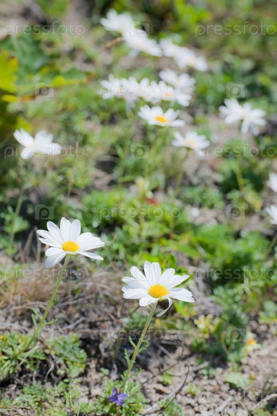 Белые ромашки на цветочной поляне