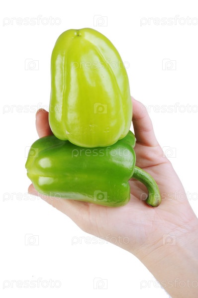 Два зеленых перца в руке на белом фоне