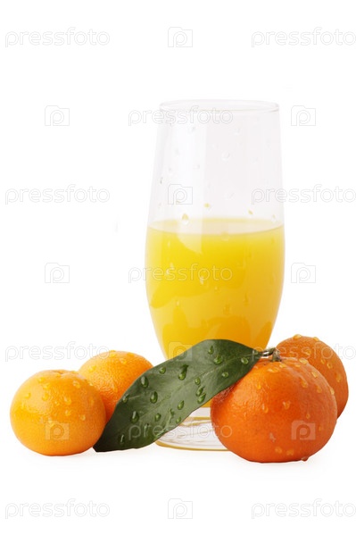 Бокал мандаринового сока с каплями воды и мандарины на белом фоне