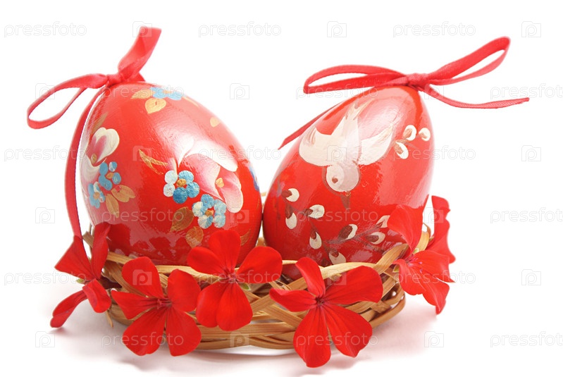 Два пасхальных яйца в корзинке крупным планом на белом фоне